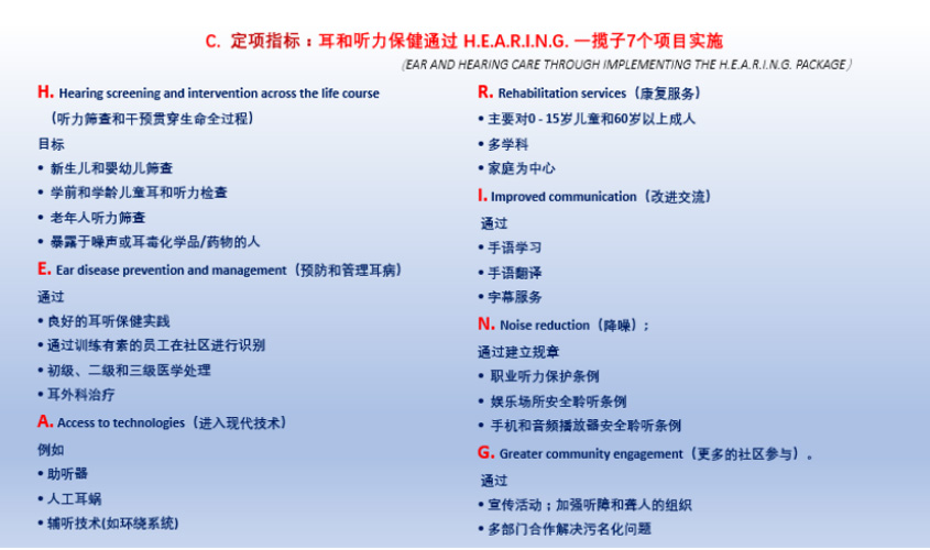 《世界聽力報(bào)告》是根據(jù)2017年《預(yù)防聾和聽力損失決議(WHA70.13)》要求編寫的,以證據(jù)為基礎(chǔ)的政策性文件,于2021年3月3日“世界聽力日”由世衛(wèi)總干事發(fā)布。該文件是政治動(dòng)員和行動(dòng)的工具,也是耳和聽力保健的教育資源,旨在指導(dǎo)會(huì)員國將耳和聽力保健納入國家衛(wèi)生計(jì)劃,人人獲得聽力保?。╤earing care for all)。